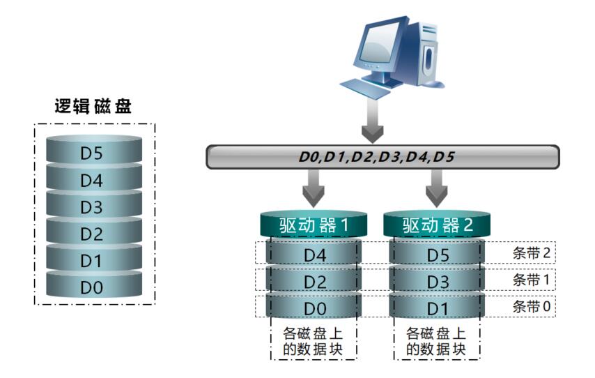 通過(guò)對(duì)硬盤(pán)上的數(shù)據(jù)進(jìn)行條帶化,實(shí)現(xiàn)對(duì)數(shù)據(jù)成塊存取,減少硬盤(pán)的機(jī)械尋道時(shí)間,提高數(shù)據(jù)存取速度;
