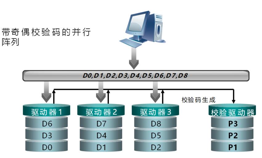 通過(guò)對(duì)一陣列中的幾塊硬盤(pán)同時(shí)讀取,減少硬盤(pán)的機(jī)械尋道時(shí)間,提高數(shù)據(jù)存取速度;
