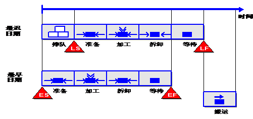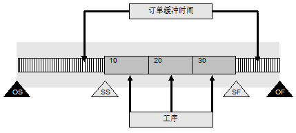排隊(duì)時間是工序的最早日期和最遲日期之間的一個間隔(見下圖)。在每次排產(chǎn)進(jìn)行期間系統(tǒng)為單個的工序段計(jì)算最早和最遲的日期。