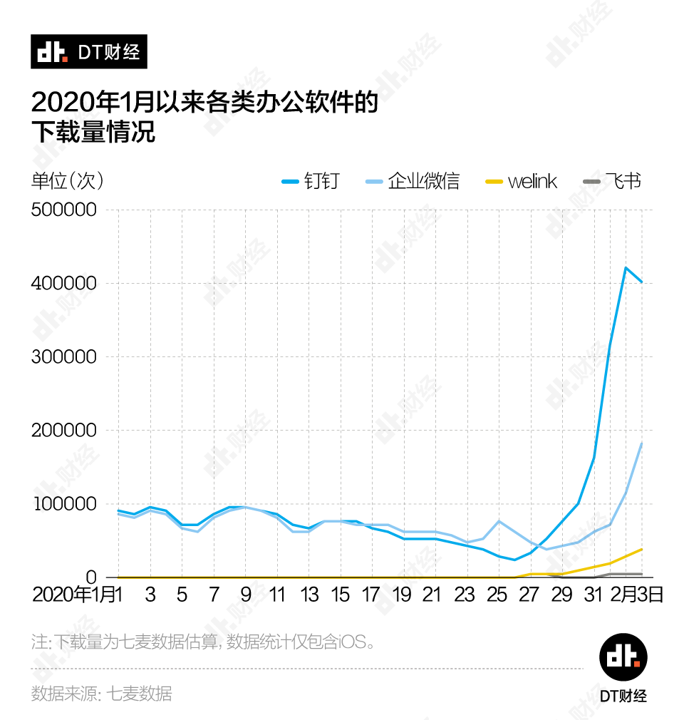 下圖是財經(jīng)雜志做的主流遠(yuǎn)程辦公軟件下載統(tǒng)計,可以看到1月底日下載量明顯提升。