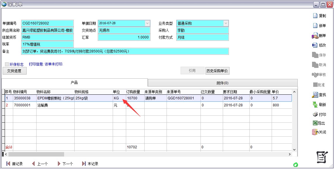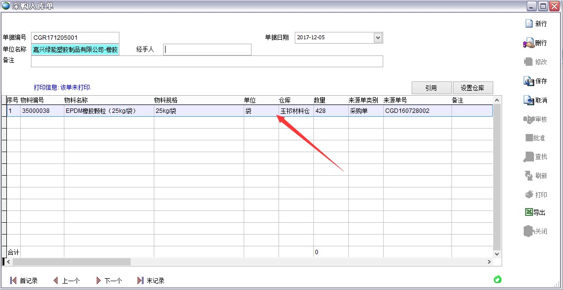 如下圖的橡膠顆粒,采購單上是kg,入庫單時自動換算成袋