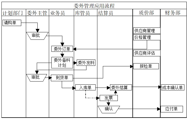 生產(chǎn)計(jì)劃系統(tǒng)生成的委外計(jì)劃訂單及車間訂單系統(tǒng)產(chǎn)生的臨時(shí)委外訂單經(jīng)過(guò)確認(rèn)生成委外請(qǐng)購(gòu)單,委外管理系統(tǒng)接受請(qǐng)購(gòu)單生成委外訂單,同時(shí)生成委外備料計(jì)劃,委外訂單發(fā)往委外廠家,同時(shí)按照委外備料計(jì)劃給委外廠家發(fā)料或定期批量發(fā)料;委外生產(chǎn)成品入廠后物流過(guò)程類似采購(gòu);委外結(jié)算過(guò)程除結(jié)算委外費(fèi)用外,還要考慮委外扣料(對(duì)于長(zhǎng)期委外廠家定期發(fā)料)的委外耗料的內(nèi)部成本結(jié)算。