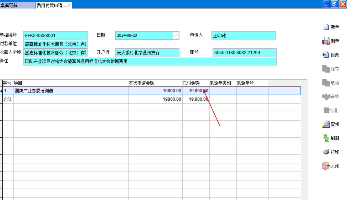 打開路徑:【主菜單】-【資金】-【費(fèi)用付款申請單】