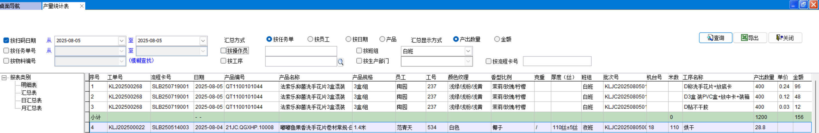 產(chǎn)量統(tǒng)計表可以按任務(wù)單、員工、日期、產(chǎn)品進行匯總