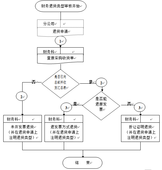 ① 分公司對(duì)采購(gòu)?fù)素浬暾?qǐng)進(jìn)行審批,財(cái)務(wù)科注明退貨類型 分公司