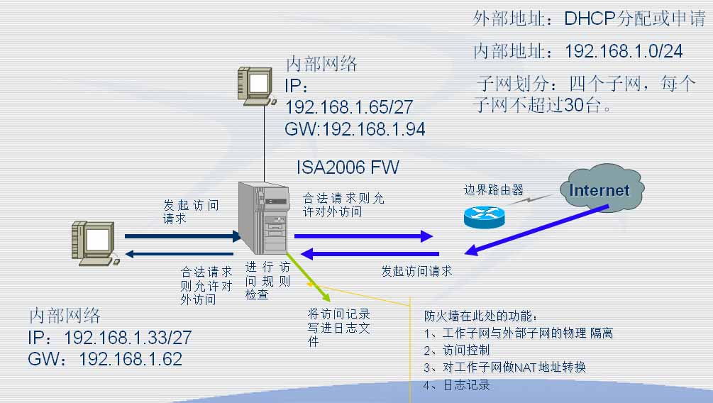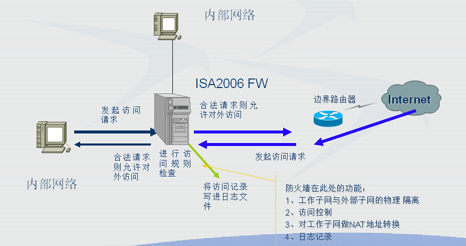在今天的企業(yè)網(wǎng)組建中,少不了重要的網(wǎng)絡(luò)安全設(shè)備即防火墻。有人做過(guò)統(tǒng)計(jì),80%的企業(yè)購(gòu)買網(wǎng)絡(luò)安全產(chǎn)品首選防火墻,什么樣的防火墻受如此歡迎呢?。防火墻有硬件和軟件之分,硬件防火墻性能好,但價(jià)格高,升級(jí)慢;軟件防火墻價(jià)格相對(duì)低,升級(jí)快而方便,但性能稍微差一些,由于計(jì)算機(jī)運(yùn)行速度快,這個(gè)問(wèn)題是可以克服的。因此軟件防火墻中,微軟的ISA Server2006防火墻功能強(qiáng),性能好,適合大中型企業(yè)。防火墻是企業(yè)網(wǎng)安全的基本配置,有很高的性能,有比較多和強(qiáng)大的功能,企業(yè)網(wǎng)的很多安全策略都是依賴防火墻實(shí)現(xiàn)的,如何在防火墻上實(shí)現(xiàn)這些安全策略?