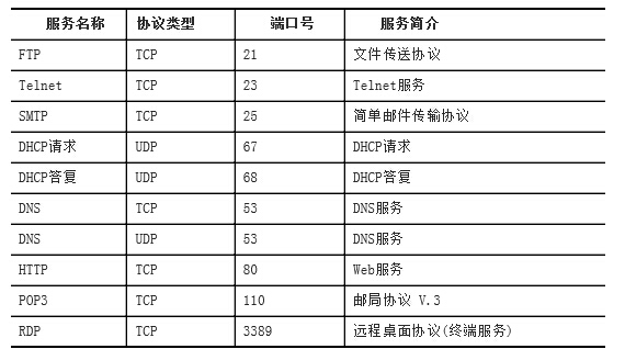 每一項(xiàng)服務(wù),都有一個(gè)端口(或多個(gè)端口)與之對應(yīng),可以使用的端口號從1到65535之間選擇,系統(tǒng)服務(wù)通常使用1024以下的端口。使用哪個(gè)端口號提供服務(wù)都可以,但對于一些常見的服務(wù),通常使用一些固定的端口,例如Web服務(wù)使用TCP的80端口,F(xiàn)TP服務(wù)使用TCP的21端口,Windows終端服務(wù)使用TCP的3389端口等,要使用防火墻及代理服務(wù)器,首先要記住一些常見的端口號,表11-2列出了常見服務(wù)及對應(yīng)的端口號,請大家參考。