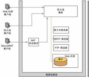 “防火墻客戶端”是已經(jīng)安裝并啟用防火墻客戶端軟件的計(jì)算機(jī)。來自防火墻客戶端的請求會(huì)定向到 ISA Server計(jì)算機(jī)上的防火墻服務(wù),以確定是否允許訪問。此后,可以使用應(yīng)用程序篩選器和其他插件對這些請求進(jìn)行篩選。防火墻服務(wù)還可以緩存所請求的對象,或者從 ISA Server緩存提供對象。