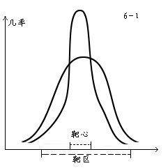 “你們大概看過這條線不止一次了!彪m然如此,我仍然解釋:“這個射手連靶區(qū)也沾不上的幾率的確很低,射中靶心的幾率也不會是百分之百,但比射中靶區(qū)其他位置的幾率高。而這條就是另外一位更出色的射手的幾率分布線!比缓笪耶嬃肆硗庖粭l更窄更高的高斯曲線。(圖6-1)