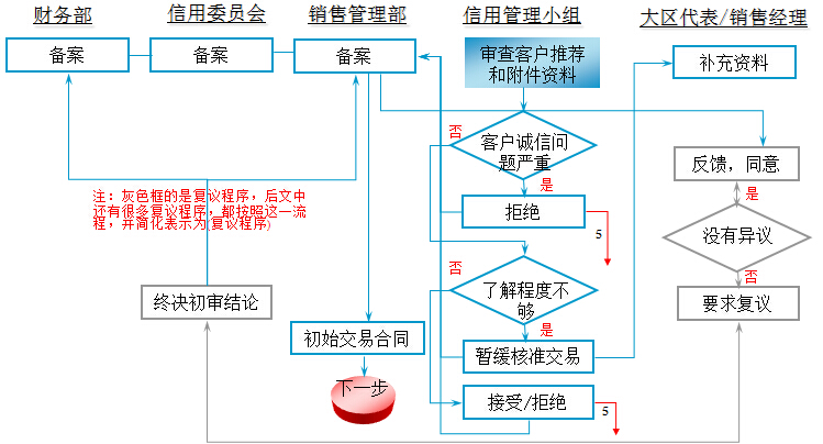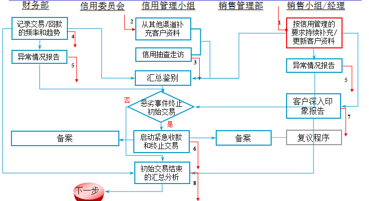 1:與銷售核對(duì)所有的客戶資料、走訪記錄和印象評(píng)審表的內(nèi)容;與財(cái)務(wù)核對(duì)初始交易期間的所有交易和回款記錄;也包括整理信用管理自己的收集資料和走訪記錄