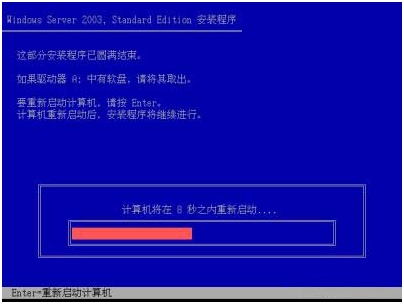 這部分安裝程序已經(jīng)完成,系統(tǒng)將會(huì)自動(dòng)在15秒后重新啟動(dòng),將控制權(quán)從安裝程序轉(zhuǎn)移給系統(tǒng)。這時(shí)要注意了,建議在系統(tǒng)重啟時(shí)將硬盤設(shè)為第一啟動(dòng)盤(不改變也可以)。 重新啟動(dòng)后,首次出現(xiàn)Windows Server 2003啟動(dòng)畫面。