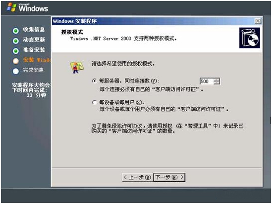如果你想將系統(tǒng)做成服務(wù)器就選“每服務(wù)器。同時(shí)連接數(shù)”并更改數(shù)值(10人內(nèi)免費(fèi))。否則你隨便選啦,反正差別不大,點(diǎn)“下一步”按鈕