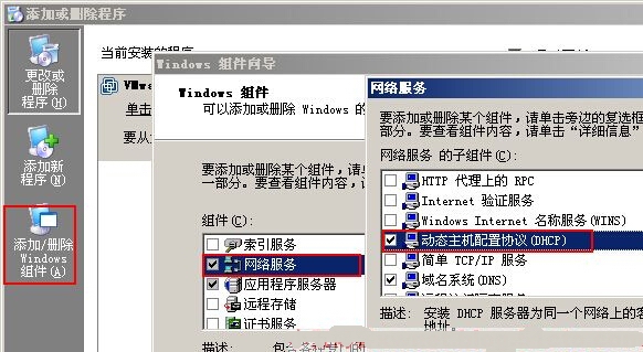 1)單擊開(kāi)始-控制面板-添加或刪除程序,單擊添加/刪除Windows組件-網(wǎng)絡(luò)服務(wù)-動(dòng)態(tài)主機(jī)配置協(xié)議(DHCP)