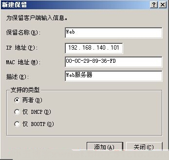 四、設(shè)置保留IP 保留IP主要用戶(hù)分配給特定的用戶(hù)或者服務(wù)器,以確保在DHCP模式下那些特定的用戶(hù)或者服務(wù)器可以得到固定的IP。 1)右鍵單擊保留,選擇新建保留 2)完成