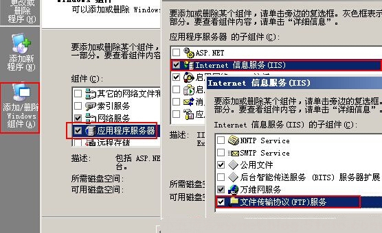 1)單擊開始-控制面板-添加或刪除程序,單擊添加/刪除windows組件,雙擊應(yīng)用程序服務(wù),雙擊Internat信息服務(wù)(IIS),勾選文件傳輸協(xié)議(FTP)服務(wù)