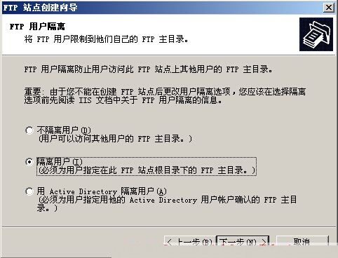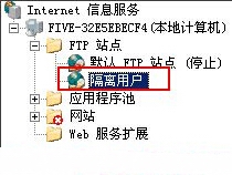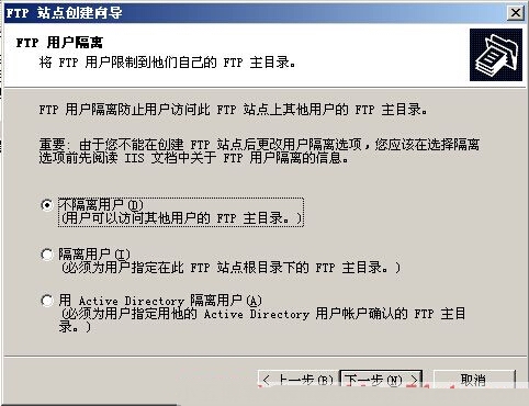 三、創(chuàng)建隔離用戶FTP 1)參照創(chuàng)建不隔離用戶FTP第一到第三步,修改第一步的名稱為不隔離用戶 2)選擇隔離用戶
