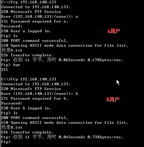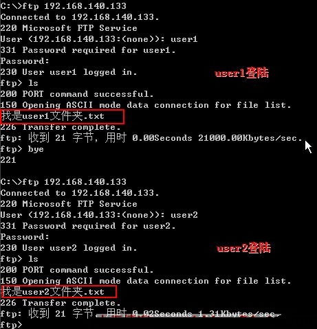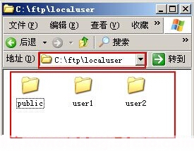 3)參考創(chuàng)建不隔離用戶FTP的第五到第六步 4)FTP站點(diǎn)創(chuàng)建完成 5)建立兩個(gè)系統(tǒng)賬戶user1,user2,用于FTP訪問(wèn)用戶 6)在主FTP目錄下建立相應(yīng)文件夾,并建立不同文件內(nèi)容。注意,我們的主目錄是ftp,因?yàn)槲覀冞x擇的是用戶隔離模式,如果是在工作組模式下,就要在主目錄下建立localuser文件夾,然后在其下建立與各個(gè)用戶名相同的文件夾。如果是在域模式,需要在主目錄下建立域服務(wù)器的NetBios名的文件夾,然后在其下建立與各個(gè)用戶相同的文件夾 7)測(cè)試