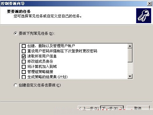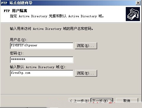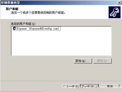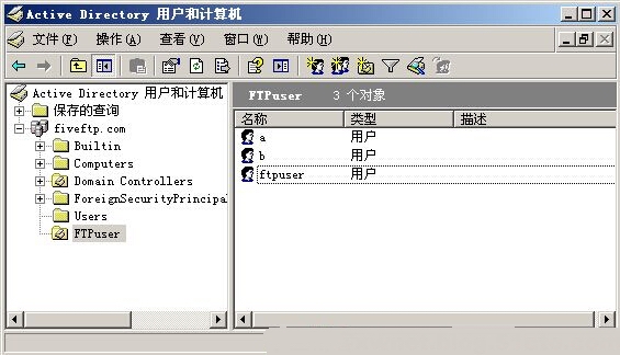 四、創(chuàng)建基于Active Directory隔離用戶的FTP 1、建立主FTP目錄與用戶FTP目錄 2、建立用戶帳戶,用戶a,用戶b,再創(chuàng)建一個(gè)讓FTP站點(diǎn)可以讀取用戶屬性的域用戶賬戶FTPuser。 3)FTP站點(diǎn)必須能夠讀取位于AD內(nèi)的域用戶賬戶的FTProot與FTPdir兩個(gè)屬性,才能夠得知該用戶主目錄的位置,因此我們先要為FTP站點(diǎn)創(chuàng)建一個(gè)有權(quán)限讀取這兩個(gè)屬性的用戶帳戶.通過(guò)委派控制來(lái)實(shí)現(xiàn)。右鍵單擊fiveftp.com選擇委派控制,彈出向?qū)螕粝乱徊嚼^續(xù) 4)設(shè)置委派任務(wù) 5)新建FTP參見(jiàn)創(chuàng)建不隔離用戶FTP步驟,需要修改隔離方式為Active Directory隔離用戶,修改描述為AD隔離用戶,修改IP為192.168.140.133,端口為21 6)指定Active Directory憑據(jù),單擊下一步后會(huì)彈出密碼確認(rèn),只需重新輸入一次密碼即可