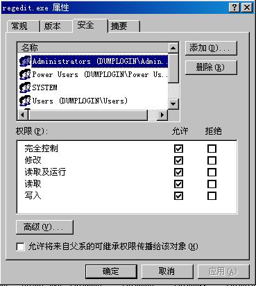 四、系統(tǒng)文件權(quán)限的分類 當(dāng)要給文件設(shè)置權(quán)限的時候,要首先保證該分區(qū)格式為NTFS(Windows NT的文件系統(tǒng)),當(dāng)然你也可以使用文件分配表(FAT)格式,但是FAT文件系統(tǒng)沒有對文件的訪問權(quán)限加以任何限制,F(xiàn)AT只在那些相對來講對安全要求較低的情況下使用。在NTFS文件系統(tǒng)中,可以使用權(quán)限對單個文件進行保護,并且可以把該權(quán)限應(yīng)用到本地訪問和網(wǎng)絡(luò)訪問中。在NTFS文件系統(tǒng)上,可以對文件設(shè)置文件權(quán)限,對目錄設(shè)置目錄權(quán)限,用于指定可以訪問的組和用戶以及允許的訪問等級時。 如果實施了NTFS的文件系統(tǒng)格式,可通過系統(tǒng)的資源管理器直接來管理文件的安全,設(shè)置目錄或文件的權(quán)限。 以regedit.exe文件為例,右鍵選擇“屬性”, 在“安全”標(biāo)簽里面選擇不同組的名稱,就可以更改配置他們對該文件的操作權(quán)限。 基于文件級的權(quán)限可以分配下面幾種:讀。ㄓ脩艨梢宰x取該文件的內(nèi)容),寫入(用戶可以寫入數(shù)據(jù)到該文件中),讀取及執(zhí)行(用戶可以執(zhí)行該程序),修改(用戶可以修改該文件內(nèi)容,包括刪除),完全控制(以上所有權(quán)限都有)。因此,適當(dāng)?shù)貫椴煌瑱?quán)限的帳號分配相應(yīng)的訪問權(quán)限(在”允許”,”拒絕”欄分別打勾,如下圖)對于文件系統(tǒng)的安全是致關(guān)重要的。