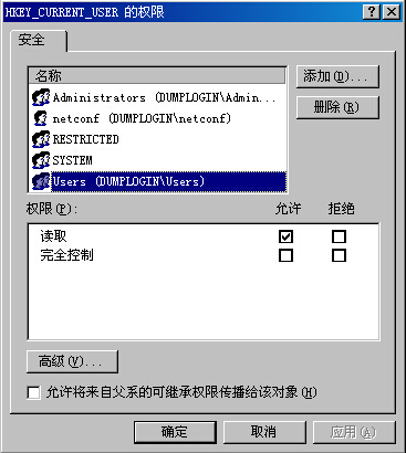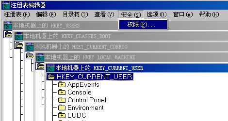 五、如何保護注冊表的安全 Windows NT/2000中的注冊表(Registry)是一系列的數(shù)據(jù)庫文件,主要存儲在 系統(tǒng)安裝目錄\ System32\Config下,有些注冊表文件建立和存儲在內(nèi)存中,這些文件的備份也存儲在 系統(tǒng)安裝目錄\Repair下。由于所有配置和控制系統(tǒng)數(shù)據(jù)最終都存在于注冊表中,而且Registry的缺省權(quán)限設(shè)置是對“所有人”“完全控制”(FullControl)和“創(chuàng)建”(Create),這種設(shè)置可能會被惡意用戶刪除或者替換掉注冊表(Registry)文件。所以,如果注冊表權(quán)限沒有設(shè)置好的話,整個 Windows NT/2000的系統(tǒng)就不安全,因此我們必須控制注冊表的訪問權(quán)。 對于注冊表(Registry),建議應(yīng)嚴(yán)格限制只能在本地進行注冊,不能被遠程訪問,限制對注冊表(Registry)編輯工具的訪問。具體可以利用文件管理器設(shè)置只允許網(wǎng)絡(luò)管理員使用注冊表編輯工具regedit.exe或regedt32.exe,其他任何用戶不得使用;還可使用第三方工具軟件,比如Enterprise Administrator (Mission Critical Software)來鎖住注冊表(Registry);蛘甙褜ψ员砣笔〉乃杏脩舳寄堋巴耆刂啤钡臋(quán)利改成只能“讀取”。 在“開始”“運行”里面輸入regedt32如下圖: 假設(shè)我們將HKEY_CURRENT_USER支更改成一般用戶只能讀,在菜單中選擇“安全”“權(quán)限” 如下圖: 選擇組用戶users(在win2000系統(tǒng)中默認(rèn)uers是一般用戶,如果在上面列表中沒有定義users組權(quán)限,可以選擇”添加”按紐,將該組進行權(quán)限設(shè)置)