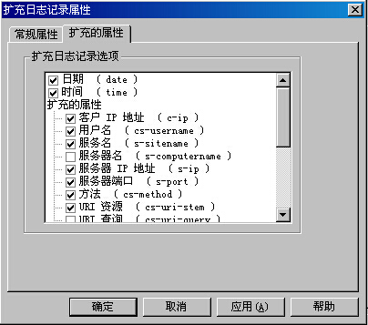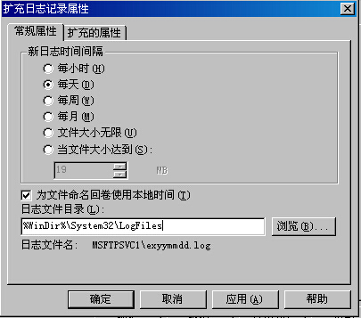 “新日志時間間隔”意思是每隔多長時間系統(tǒng)日志單獨寫成新的一個文件,比如:選擇“每天”,那么每天在日志文件目錄下就會多一個新的文件,該文件內(nèi)容主要是記錄當(dāng)天的訪問記錄。 還可以選擇按大小來拆分,選擇:“當(dāng)文件大小達(dá)到”一定大小的時候,才會生成一個新的文件,系統(tǒng)默認(rèn)是每天單獨記錄在一個文件里。 在“擴充的屬性”里面,允許用戶選擇記錄哪些內(nèi)容以及格式等。