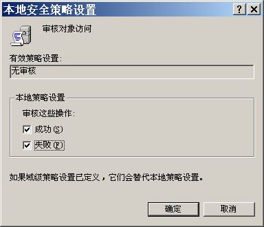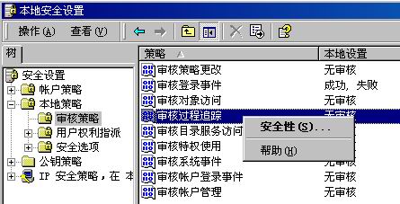 首先進(jìn)入“控制面板”,打開“管理工具”程序組,選擇“本地安全策略”;在“本地安全策略”窗口的控制臺目錄樹中,單擊“本地策略”;然后選擇“審核策略”, 選中要審核的事件,在操作菜單中選擇“安全性”(也可以右鍵),或是雙擊所選擇的審核事件;在策略設(shè)置窗口中,選擇 “成功”復(fù)選框或“失敗”復(fù)選框,或是將二者全部選中見下圖所示: