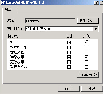 對打印機(jī)訪問的審核 對打印機(jī)訪問進(jìn)行審核,要求必須為對象訪問事件設(shè)置審核策略。滿足這個(gè)條件就能夠?qū)μ囟ǖ拇蛴C(jī)進(jìn)行審核,并能夠?qū)徍酥付ǖ脑L問類型以及審核擁有訪問權(quán)限的用戶。審核步驟如下:首先選取打印機(jī)的屬性窗口,選擇“安全”頁面,點(diǎn)擊“高級”按鈕;然后在“審核”頁面,點(diǎn)擊“添加”按鈕,選擇想對打印機(jī)訪問進(jìn)行審核的用戶或組(過程和上圖基本類似);最后還要在“項(xiàng)目審核”窗口中,在“應(yīng)用到”下拉列表中選擇審核應(yīng)用的目標(biāo),在“訪問”列表中為審核的事件選擇“成功”或“失敗”檢查框。設(shè)置完成后,請點(diǎn)擊“確定”。相關(guān)界面見下圖: