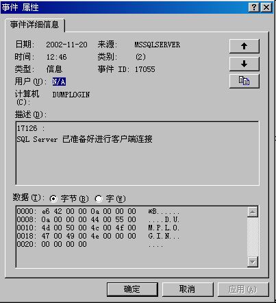 其中,描述欄里面就是對應(yīng)事件的詳細(xì)描述,如果該事件和數(shù)據(jù)有關(guān),比如內(nèi)存段訪問錯(cuò)誤,那么在數(shù)據(jù)段里就會(huì)有相關(guān)的數(shù)據(jù) FTP和WWW服務(wù)的日志是文本文件,直接通過記事本就可以進(jìn)行查看。比如某FTP服務(wù)器日志: