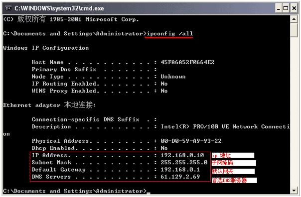 圖6-03 在光標閃動出輸入 ipconfig /all 直接回車,可查看得到本機的IP地址相關信息,記下這個,接下來將用到