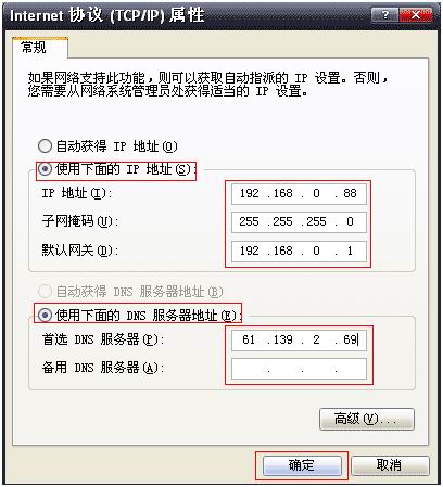 第八步:選擇【使用下面的IP地址】,輸入IP地址,將以上介紹的第三步看到的【ip地址】、【子網(wǎng)掩碼】、【默認網(wǎng)關】、【首選DNS服務】數(shù)值,分別輸入以上對應的框框,在這里特別說明一下【IP地址】最后的一個值,我們一般輸入容易記住的數(shù)值(在2-254的自然數(shù)中選擇一個),并記住這個IP地址,這個就是其他客戶端登陸需要的地址,如下圖6-08
