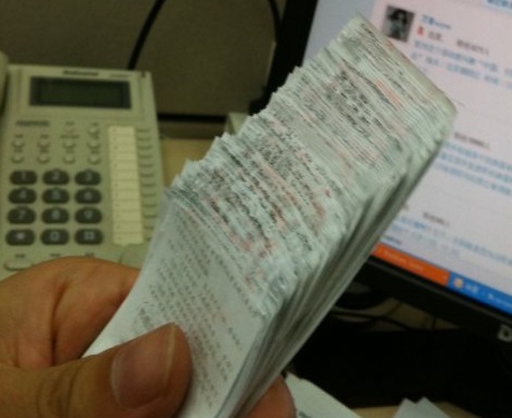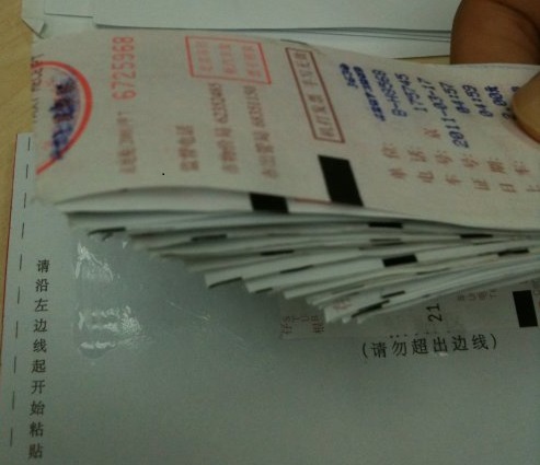 STEP2:然后將它們弄出一個(gè)斜坡,然后在紙上涂滿膠水,直接將一疊發(fā)票的斜坡整體貼上去,就大功告成了,速度絕對(duì)非?,絕對(duì)非?欤絕對(duì)非?。(論如何讓審計(jì)發(fā)瘋)