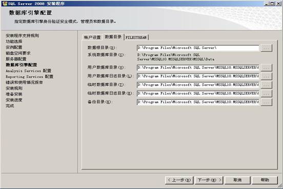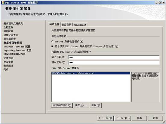 36.在帳戶設(shè)置里面,選擇“混合模式”的身份驗(yàn)證模式,輸入SQL Server系統(tǒng)管理員帳戶的密碼,點(diǎn)擊【添加當(dāng)前用戶】按鈕,然后對(duì)數(shù)據(jù)安裝目錄進(jìn)行設(shè)置,點(diǎn)擊【數(shù)據(jù)目錄】,如下圖所示: