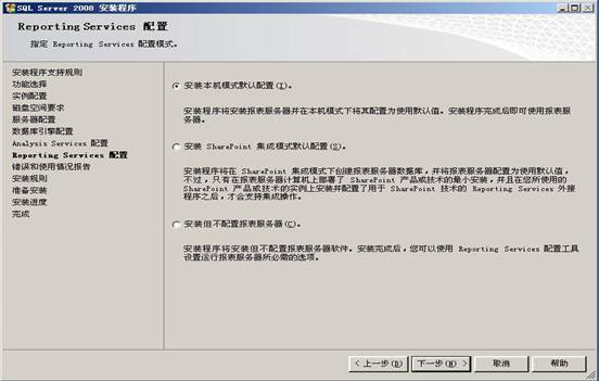 38.Analysis Services(分析服務(wù))主要是為商業(yè)智能解決方案提供聯(lián)機(jī)分析處理 (OLAP) 和數(shù)據(jù)挖掘功能。點(diǎn)擊【添加當(dāng)前用戶】按鈕, SYSTEM的系統(tǒng)帳戶(Administrator)即可添加到相應(yīng)的表框內(nèi),然后點(diǎn)擊【下一步】,出現(xiàn)Reporting Services(報(bào)表服務(wù))的界面,如下圖所示: