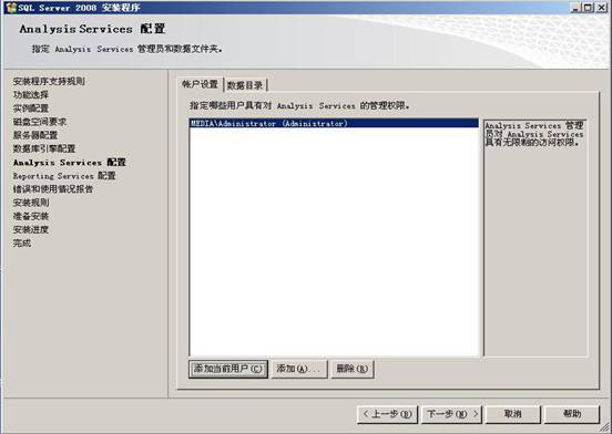 37.選擇SQL安裝相關(guān)目錄的具體路徑,點(diǎn)擊【下一步】, 出現(xiàn)Analysis Services(分析服務(wù))的界面,如下圖所示: