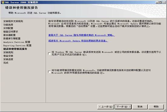 39.Reporting Services (報(bào)表服務(wù))包含用于創(chuàng)建和發(fā)布報(bào)表及報(bào)表模型的圖形工具和向?qū)В挥糜诠芾?/SPAN> Reporting Services 的報(bào)表服務(wù)器管理工具;以及用于對(duì) Reporting Services 對(duì)象模型進(jìn)行編程和擴(kuò)展的應(yīng)用程序編程接口。選擇“安裝本機(jī)模式默認(rèn)配置”,點(diǎn)擊【下一步】,出現(xiàn)錯(cuò)誤和使用情況報(bào)告的界面,如下圖所示: