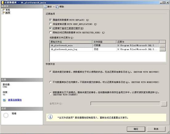 14.選擇“覆蓋現(xiàn)有數(shù)據(jù)庫”和“還原每個備份之前進(jìn)行提示”,其它設(shè)置不變,點(diǎn)擊【確定】按鈕,出現(xiàn)如下圖所示對話框: