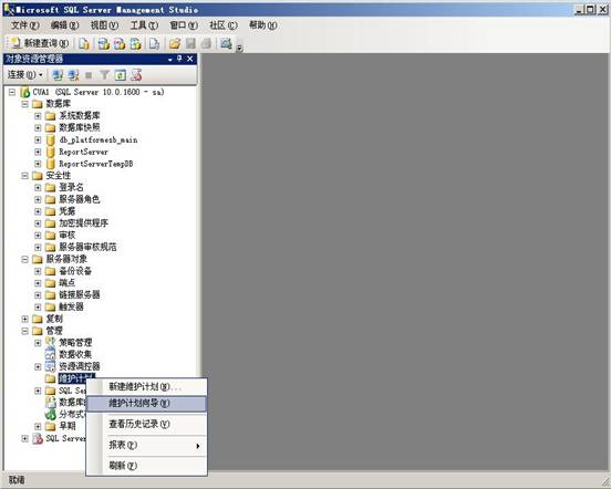 1.打開SQL Server 2008管理界面,展開SQL Server組-管理-維護(hù)計(jì)劃,右鍵【維護(hù)計(jì)劃】,如下圖所示: