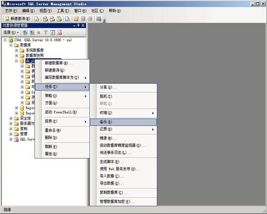 1.打開SQL Server 2008管理界面,選擇需要手動備份的數(shù)據(jù)庫,右鍵【任務(wù)】-【備份】,如下圖所示: