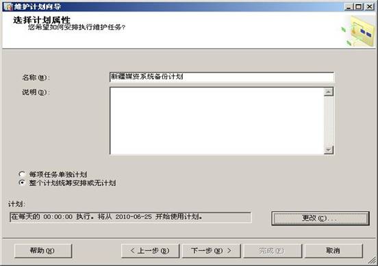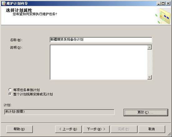 4.輸入執(zhí)行維護(hù)任務(wù)的名稱,選擇“整個計(jì)劃統(tǒng)籌安排或無計(jì)劃”,點(diǎn)擊【更改】按鈕,對作業(yè)計(jì)劃屬性進(jìn)行修改,如下圖所示: