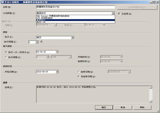 5.根據(jù)實(shí)際情況,選擇計(jì)劃類型、執(zhí)行頻率、執(zhí)行任務(wù)的開始及結(jié)束日期,確認(rèn)無誤后,點(diǎn)擊【確定】按鈕,如下圖所示: