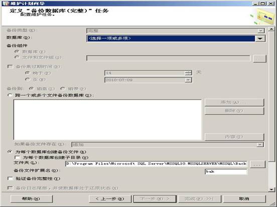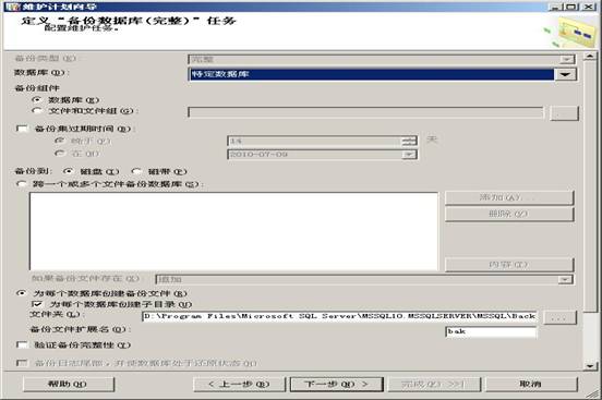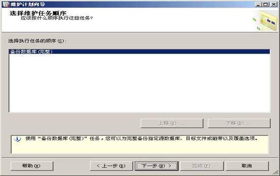 8.用戶可以根據(jù)實際情況對維護(hù)任務(wù)的執(zhí)行順序進(jìn)行修改,點擊【下一步】,出現(xiàn)定義“備份數(shù)據(jù)庫(完整)”任務(wù)的對話框,如下圖所示: