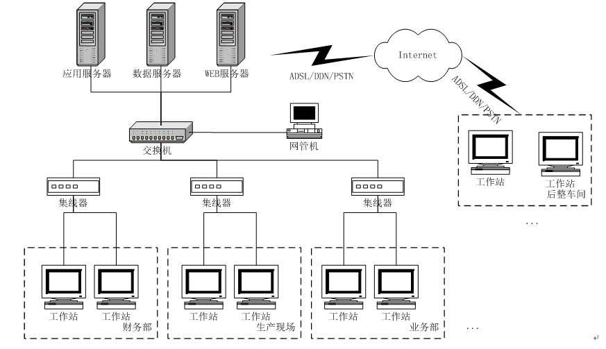 本系統(tǒng)考慮可擴(kuò)展性及未來系統(tǒng)要求,在邏輯上設(shè)三臺(tái)服務(wù)器,分別是應(yīng)用服務(wù)器、數(shù)據(jù)服務(wù)器、WEB服務(wù)器。三個(gè)服務(wù)器通過中心交換機(jī)與企業(yè)內(nèi)部網(wǎng)絡(luò)(LAN)相連,中心交換機(jī)通過級(jí)聯(lián)與各個(gè)工作站連接在一起,組成本系統(tǒng)的硬件網(wǎng)絡(luò)環(huán)境。另外,內(nèi)部網(wǎng)絡(luò)可以通過PSTN/ADSL/DDN等方式上聯(lián)接入Internet,提供外聯(lián)接口,各個(gè)其它車間可以通過Internet訪問本地服務(wù)器。