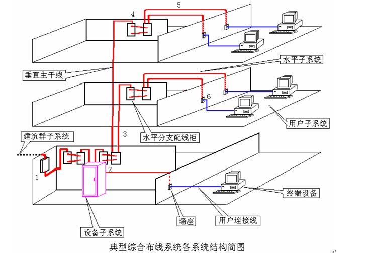 根據(jù)布線系統(tǒng)的建議,綜合布線系統(tǒng)可劃分為工作區(qū)子系統(tǒng)、水平子系統(tǒng)、管理子系統(tǒng)、垂直子系統(tǒng)和樓群子系統(tǒng)6大子系統(tǒng)構(gòu)成,以下是構(gòu)成圖: