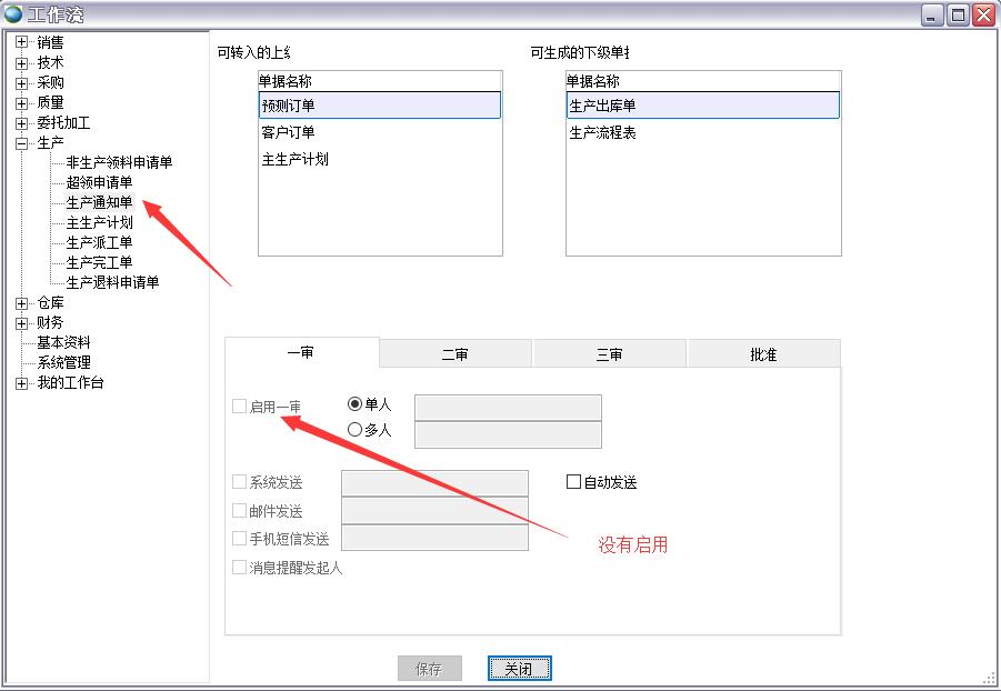 生產(chǎn)通知單審批可以批量完成對(duì)生產(chǎn)通知單的審核、反審核、批準(zhǔn)、反批準(zhǔn)操作 工作流的設(shè)置 在批量審批前必須先設(shè)置工作流,如果沒有設(shè)置工作流,無(wú)法進(jìn)行批量審批 舉例 下面以一審進(jìn)行舉例 生產(chǎn)通知單已一審 啟用一審 用生產(chǎn)通知單審批進(jìn)行反審核 反一審后生產(chǎn)通知單一審狀態(tài)被取消 相關(guān)知識(shí) 生產(chǎn)通知單 工作流